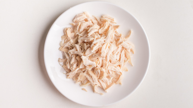 Once the bottom layer of tortillas is prepared, next you'll layer veggies, meat, dairy, and sauce into your dish. What ingredient you start with is up to you, however, adding in the shredded chicken first can create a sturdy base. Alternating between the five layers is key, though you should make the last layer tortillas and then top it all off with cheese and sauce. When the dish emerges from the oven, it will have a golden crust from the cheese and a hearty layer of sauce.