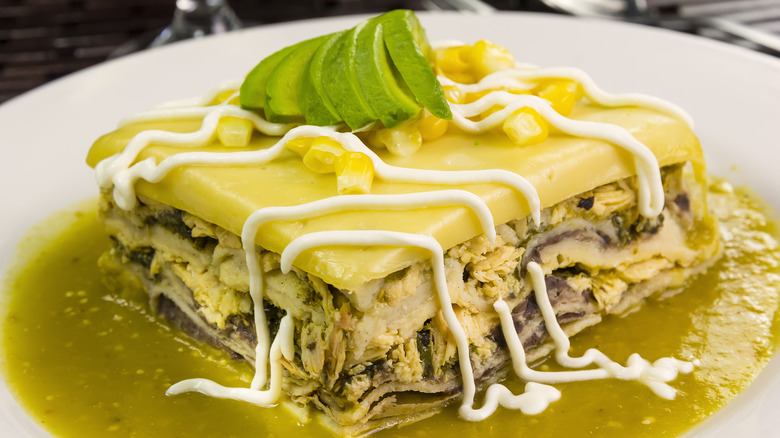Pastel Azteca is sometimes nicknamed Mexican lasagna due to its layered approach of stacking meat between starchy tortillas. The tortillas used in this dish are typically homemade corn tortillas. Using flour tortillas isn't recommended as it would likely result in a soggy mess that isn't as pleasant to bite into. The protein of choice that's stuffed between the tortillas layers is usually shredded chicken. However, this base can be swapped for other poultry meat like turkey.