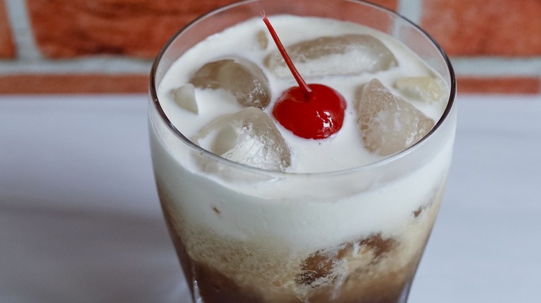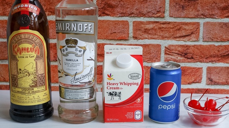 The ingredients list is short and sweet — you'll need vanilla vodka, coffee liqueur (such as Kahlúa), any type of cola, heavy whipping cream, and optionally a cherry for garnish. "I did two things in this recipe to make it even more like an ice cream soda than a standard Colorado Bulldog," says Morone, "and that was to use vanilla vodka rather than regular vodka, to make it more of like a vanilla ice cream flavor, and I increased the amount of cola in it."