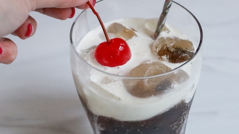 Pour the heavy cream into the glass and give it a gentle stir. You can opt to fully mix the cream into the cocktail, or you can follow Morone's lead and allow it to float at the top, which gives it that classic ice cream float look. Finally, top the drink off with a maraschino cherry — an optional garnish, but one highly recommended as it will complement the flavor of the cola nicely.