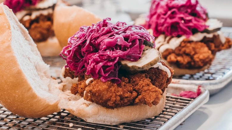 And if you're eating your hot chicken in sandwich form, it's often best served with some kind of slaw on top. When that's the case, Chef Pham says to be careful of making the meal too heavy with a bunch of hot sauce and an overly creamy slaw, which he says will result in "an oversaturated sandwich that's just too fatty and not balanced." Opt for a vinegar or cider-based slaw which will lean more acidic than creamy. "At the end of the day, you're eating fried chicken and it's already a heavy product," Pham says. "You don't want to walk away feeling really heavy."
