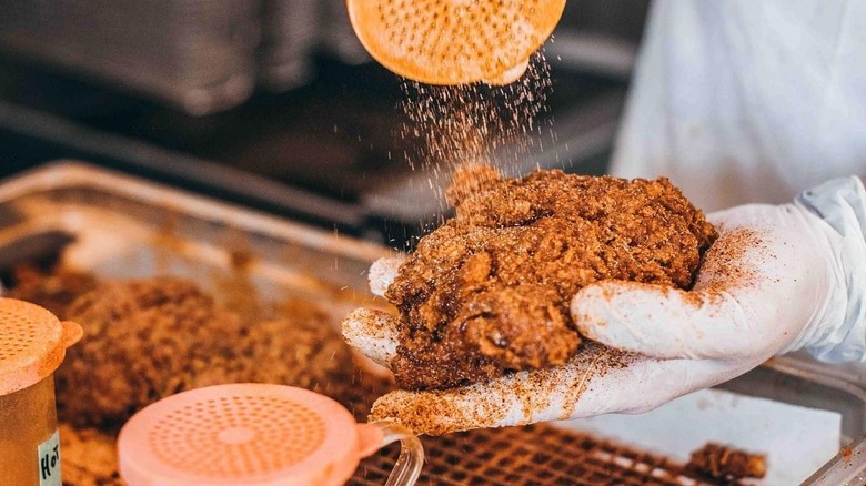 The key to great fried chicken is moisture and flavor — and brining helps achieve both things before you ever even start cooking your meat. Chef Pham opts for a dry brine over a wet brine, which imparts a lot more intense flavor directly onto the surface of your chicken. At Pretty Bird, Nashville hot chicken gets coated in sugar, salt, and white pepper. "Then we add a tiny bit of buttermilk, which binds it all together ... so that it coats all the chicken evenly," Pham says.