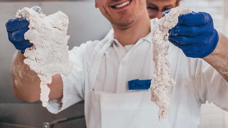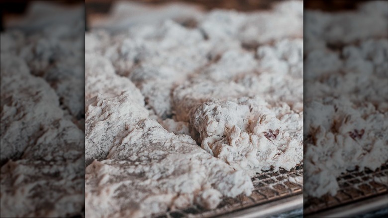 Pham emphasized that this is a crucial step in the process if you want to achieve the ideal craggy crust when you fry up your chicken. "If you were to just take the chicken and dredge it in flour and cornstarch without adding a buttermilk to the flour and working it in, you would end up just the shell," he says. "It doesn't have much texture. It'll become soggy really fast."