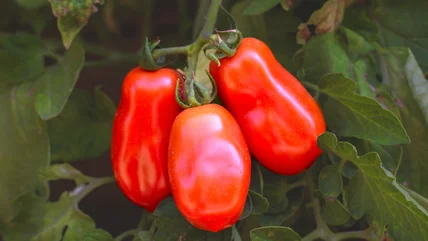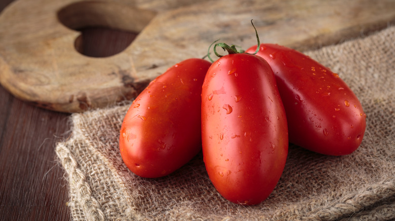 Like other plum tomatoes, the fruit of a San Marzano is oblong and contains only two seed compartments. They are red and their appearance is quite similar to Roma tomatoes, but San Marzano tomatoes are thinner and more pointed than Romas. San Marzano tomatoes also have thicker walls, so they're meatier than Roma tomatoes. All plum tomatoes share the quality of fewer seeds than a typical tomato, and San Marzanos are no exception. Fewer seeds mean San Marzanos have a thicker, less watery interior, which makes them an exceptional choice for tomato sauce. Finally, San Marzanos have a stronger, sweeter flavor than their closely-related Roma cousins, so many chefs consider them a must-have ingredient for which there is simply no substitute.