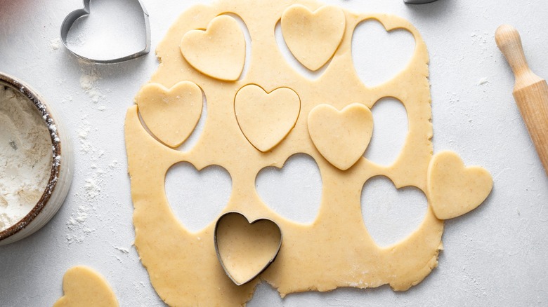 With the proper cookie cutter selected, the dough mustn't be terribly wet or warm before rolling it out, as this will cause sticking even if the work surface has been floured. Only once chilled dough has been rolled to an even thickness can cookie cutters work their magic. However, coating their borders with all-purpose flour after each cut (or every few) will minimize sticking as long as you use the proper technique — firmly and swiftly press the tool directly into the dough without twisting. Should you notice some clinging dough in between cuts, wipe down the cutters with a damp paper towel and dry them before continuing the process of dipping and pressing.
