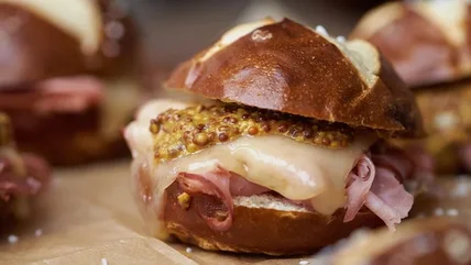 Featuring sturdy pretzel buns and a chewy filling of salty ham slices and gooey melted Swiss, these petite sandwiches are best served warm out of the oven, topped with a generous amount of tangy stone ground mustard. It's almost as if you're combining all three sports stadium favorites — pretzels, burgers, and hot dogs — in one.