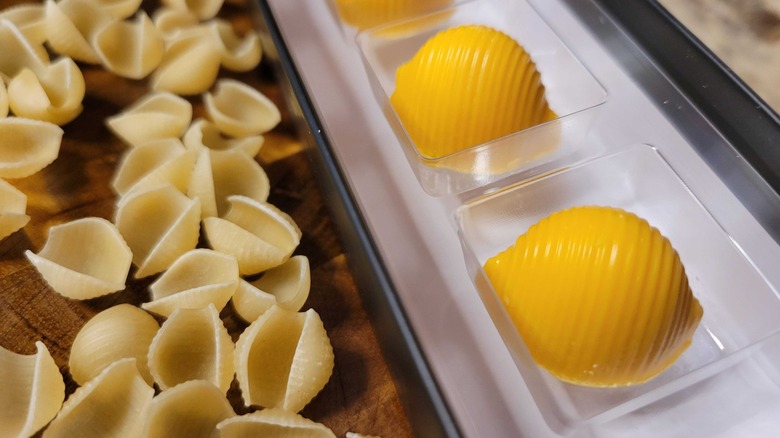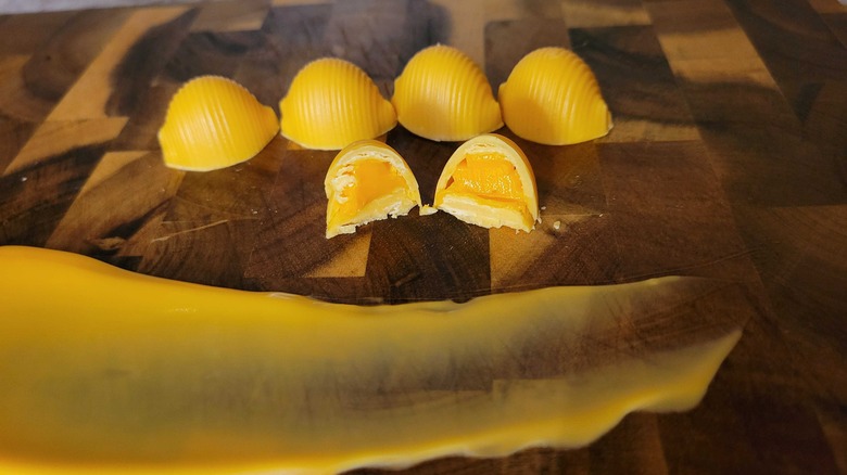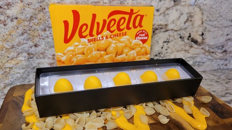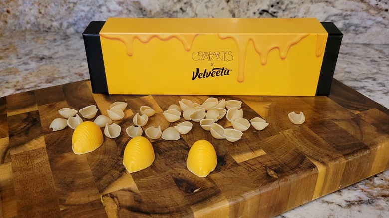 If you've ever tucked into a bowl of mac and cheese and wished that salty sensation could carry through until dessert, then you may be in luck. Renowned chocolatier Compartés has teamed up with Velveeta to produce what is a sweet version of the cheesy shell pasta many of you will be familiar with. The outside of the shell is comprised of white chocolate, while the inside is basically Velveeta cheese. As you would expect from a company like Compartés, the shells are exquisitely detailed. They're larger than the standard Velveeta shells and comparable to the cheese product manufacturer's "jumbo" pasta in size. Compartés has named this strange treat the TruffVel — as it's similar in construction to a truffle, while also being a combination of traditional chocolate and Velveeta.