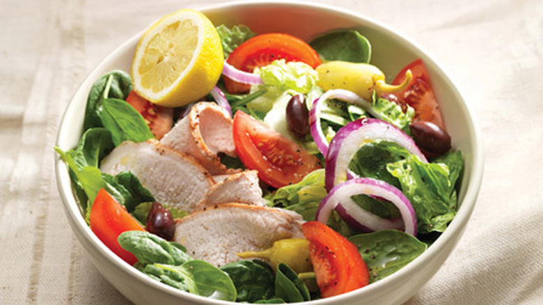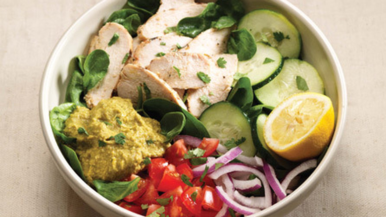 For an equally delicious and slightly heartier salad option, try Panera's Power Mediterranean Chicken Salad. This hidden menu item is made with sliced, all-natural chicken, baby spinach, romaine lettuce, tomatoes, applewood-smoked bacon, diced eggs, fresh-squeezed lemon juice, and extra virgin olive oil. It offers a little more nutritional punch than the previously mentioned Mediterranean turkey salad. This involves 360 calories, 20 grams of fat, 12 grams of carbs, and (hold your horses) an impressive 35 grams of protein.