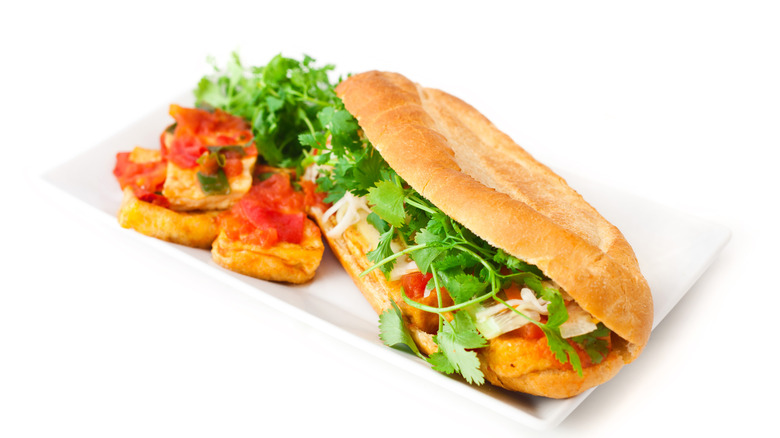 With its healthy helping of fresh cilantro, shredded carrots, cucumber slices, and pickled radishes, a banh mi looks like it'd be a fairly friendly option for vegans and vegetarians — if only it weren't for those slices of meat and oh-so-delicious chicken and pork liver pâté that cuts through every bite. That isn't to say that if you visit a banh mi shop you won't have any vegan or vegetarian options. Most shops will offer tofu as a substitute, still those will usually come with a forewarning from the shop owners clarifying that no pâté spread will be included. That just goes to show how essential it is to your bahn mi.