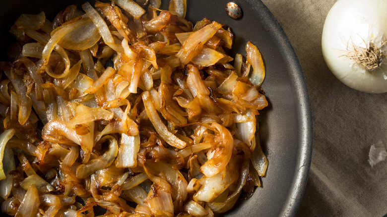 We never get tired of looking for ways to save you time in the kitchen. To that end, we've got yet another tip for cooking with baking soda. This one has to do with caramelizing onions. Caramelized onions are rich, sweet, and savory all at the same time. On top of their delicious flavor profile, these culinary gems have a soft texture that adds depth to pretty much anything you put them on. From French onion soup to caramelized onion dip, everything is better with caramelized onions. The only problem? They take 45 minutes to cook. Not exactly ideal when you've got a hankering for some tasty alliums.
