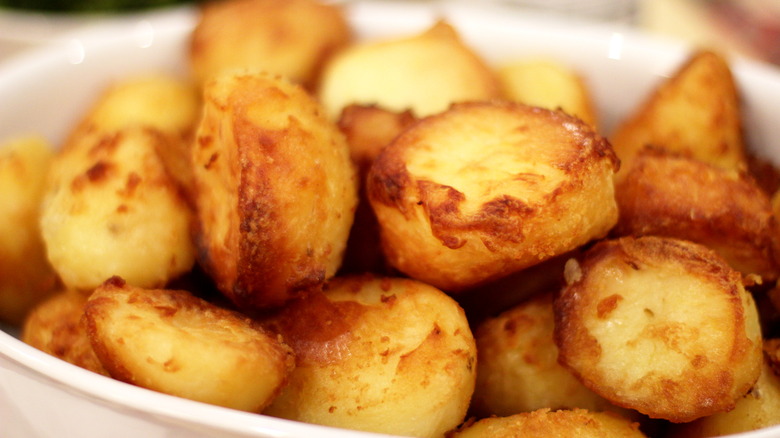 Crispy on the outside, soft on the inside — that's the goal when it comes to making perfect roast potatoes. But this perfect spud texture isn't always easy to capture. Oftentimes, you'll end up with potatoes that are either too crunchy or too mushy. Picking the right potatoes is one essential step in attaining roasted potato nirvana. Starchy varieties like russet and Yukon gold are the best. Their exteriors easily form crispy crusts, while their interiors stay soft and smooth.