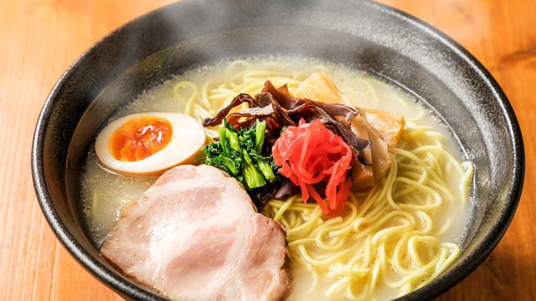 Love ramen but don't have access to an Asian grocery store? Not to fear, there's a simple way to transform your angel hair or spaghetti into ramen-ready noodles. Simply add a bit of baking soda to the pasta water during cooking. That said, the jury is out when it comes to the exact amount of baking soda to add. Some recommend using as little as 2 teaspoons per quart of water, while others suggest adding 1 tablespoon. The final amount is up to you, but our recommendation is to start with as little as possible, then add more if needed.