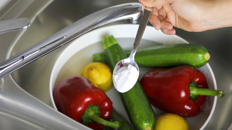Using hot water is also less than ideal, as it can cause leafy greens to wilt. On the other side of the coin, cold water isn't effective enough when it comes to removing caked-on dirt or food wax. So, what's the solution? Making your own produce wash from water and baking soda. All you need to do is mix 3 to 4 tablespoons of baking soda with room-temperature water in a large bowl. Swirl your veggies around, then rinse. This easy trick works because baking soda is effective at dissolving food wax. Its alkaline structure also helps it remove dirt and grease.