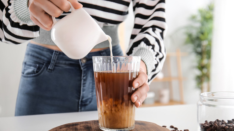 Next, add ice to a glass or cup and pour the coffee-water mixture over it. Finally, fill the glass up with cold water, and, if you'd like, a little whole milk. Or, if you don't want to consume dairy, skip the addition or select a dairy-free substitute.