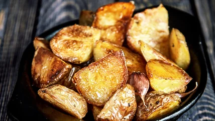 Some days you get back from a bad day at work and just want to let out some steam. Maybe you want to stomp your feet. Maybe it would feel good to smash something. We've got just the ticket: smashed potatoes. You can work out your stress by smashing up some potatoes. And as a bonus, when they're ready they'll look, feel, and taste delicious too. First of all, we recommend a Yukon Gold potato for this anger management exercise. The creaminess will make it more satisfying to smash. Then you'll need to boil the potatoes until completely done — we are long past parboiling here. Once the potatoes are cooked through, toss them with a mixture of salt, pepper, garlic granules and olive oil, take a flat-bottomed glass and begin smashing. Roast them in the oven for about 35 minutes, not before having brushed on a bit more of the oil mixture for good measure.