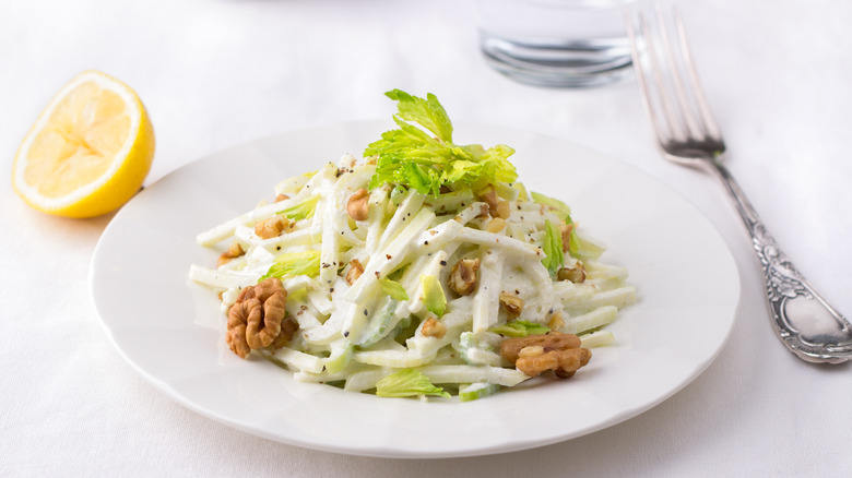 We may regard the Waldorf salad as a fancy dish since it was first created at the swanky Waldorf Astoria Hotel on Park Avenue in New York City. But as elegant as the salad can be (with the proper presentation), the original version's dressing couldn't have been simpler. The only three ingredients involved were mayonnaise, salt, and pepper — so essentially, people were just eating seasoned mayo. But it's possible that was all that was ever intended, as Food52 reports that instructions from the original recipe simply suggested the salad "be dressed with a good mayonnaise." This would be in keeping with the simplicity of the remaining elements, as early recipes were composed of little more than apples, celery, and mayo.