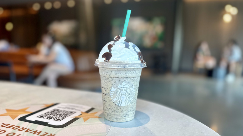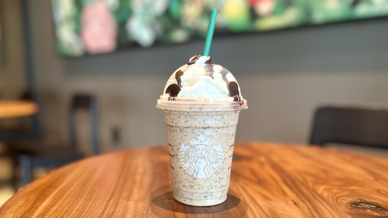Our barista chose to layer the mocha drizzle on top of the whipped cream. However, in promotional photos, the mocha drizzle is added directly to the drink before topping it off with whipped cream. We suspect this is done to showcase the attractive green and brown cookie sprinkles. Regardless of the presentation, this delightful blend promises a treat for the senses. Take note: This drink isn't exclusively for coffee drinkers. A cream-based version of the Frappuccino is also available, making it an appealing choice particularly for young ones with a fondness for mint.