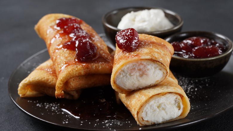 For those who've never had the pleasure of partaking, blitzes are the French crepe's slightly thicker-skinned Jewish cousin. Where crepes can be filled with either sweet or savory ingredients, blitzes on the deli menu are primarily sweet, with either a sweet farmer's cheese or cheese and fruit filling wrapped in a wheat-based pastry browned in butter and topped with berries and sour cream. Blintzes, alongside other dairy-based treats like cheesecake, are a customary part of the springtime celebration of Shavuot.