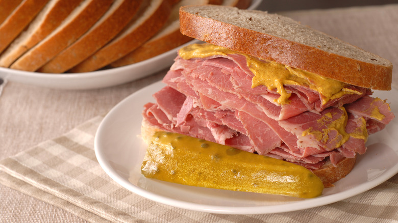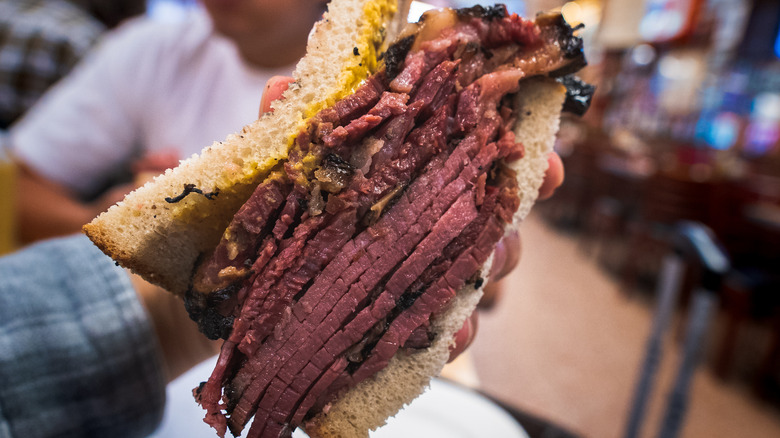 While pastrami is a classic sandwich-filling option at most Jewish delis stateside, it's not necessarily the case outside the confines of U.S. borders as it is a unique expression of the American Ashkenazi Jewish diaspora rather than a universal Jewish food. So, if you find yourself stateside, there is no better reason to load up on the good stuff, including innovative delis like Mort & Betty's, offering vegan alternatives like the mushroom pastrami, showcasing the adaptability of the cuisine to suit modern tastes.