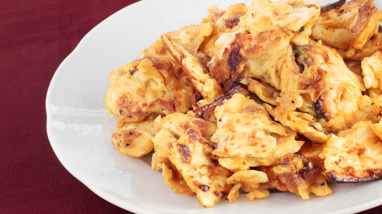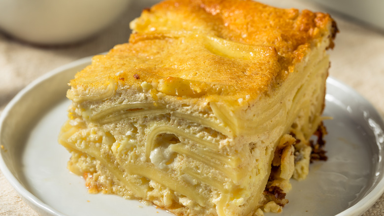 Browse any list of side dishes on any Jewish deli's menu, and you are likely to spot at least one (if not several), types of kugel offered, including potato, vegetable, and lokshen (meaning noodle). Depending on the ingredients, different varieties of kugel will feature different flavors. For instance, though savory examples do exist, noodle kugels tend to favor sweet ingredients through their usage of fruits like raisins or pineapple alongside a binding of dairy and eggs. Potato and other vegetable-based kugels, however, tend to feature more savory flavors.