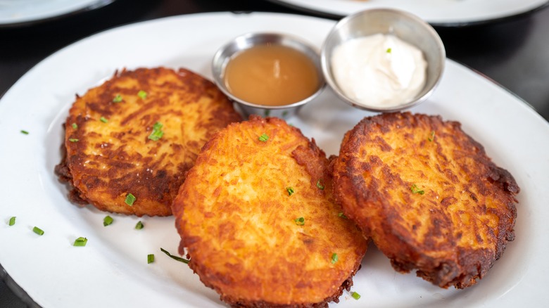 Latkes are a welcome treat no matter what time of year. We'd happily eat a stack that's been freshly fried and served simply alongside sour cream and apple sauce for dipping and slathering. Popular, too, are a more indulgent version; many delis will use the crispy potato pancakes as a substitute for bread, filling them with lashings of thinly sliced corned beef for the ultimate treat. Philly-based Hymie's takes the trend above and beyond with a special latke Reuben on its menu.