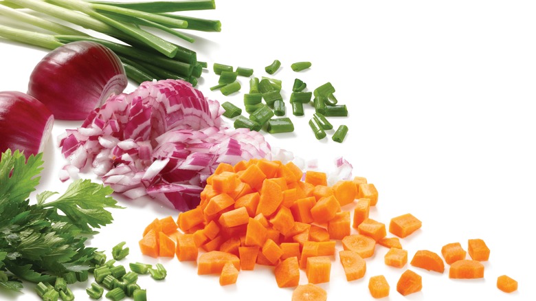 The usual suspect that you'll find is chopped celery. Fibrous and snappy, it's hard to go wrong with celery, but don't limit yourself to just one option. Red onion, diced small, brings both crunch and a nice sharp flavor to the mix. Cucumbers, leeks, and chives are all attractive options that add both a pop of green color and some subtle flavors. Water chestnuts are a unique option that is extra crunchy and absorbs the flavors of the chicken salad. Diced bell peppers will add a bit of sweetness, but if you want some heat, you can throw in some jalapeño, either fresh or pickled. Speaking of pickles, chopping up a few dill pickles is a great way to add the puckery vinegar flavor that makes pickles so irresistible.