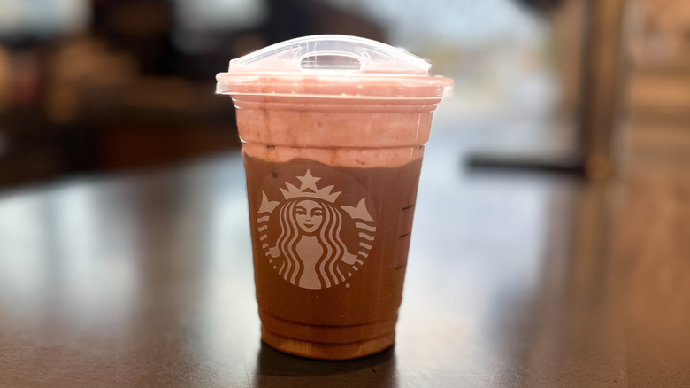 There are many different ways to liven up regular cold foam. Although most of these flavors do not change the color of the foam itself, the strawberry cold foam creates quite a lovely shade of pink. If you were to ask a barista for a unique flavor of cold foam, there's a good chance they may recommend the strawberry cold foam, commonly known as pink cold foam. And while there are certainly several different drinks you could put this foam on top to create a uniquely fruity beverage, we opted for an iced mocha topped with the pretty pink stuff.