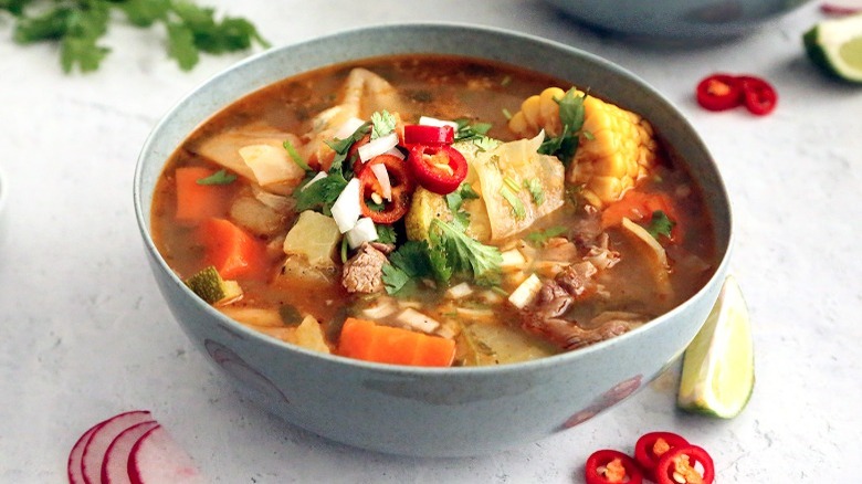 Soup is one of life's great inventions: You've got meat, vegetables, herbs, and anything else you desire all in one bowl full of savory, tasty broth. It can be a side dish or a full meal, and there's a type of soup for practically any season and diet. If you fancy yourself a beef lover who also delights in all sorts of veggies, you're going to love this recipe from Ashley Altan for caldo de res, a Mexican beef and vegetable soup that's delicious, nutritious, and full of bold flavor.