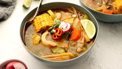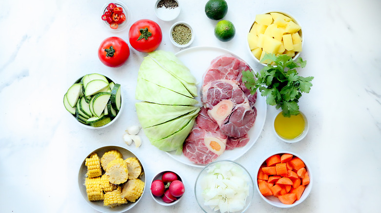 This soup does contain a lot of ingredients, but that's what makes it so good. You'll need beef shank, of course, as well as a whole bounty of veggies: cabbage, corn, carrots, potato, zucchini, onion, garlic, cilantro, and tomatoes. If you want to add even more veggie goodness to your soup, Altan suggests adding green beans, peas, and chayote. Aside from that, you'll also need olive oil, salt and pepper, and garnishes if you desire: sliced jalapeños and radishes, chopped cilantro, lime wedges, and diced onion.