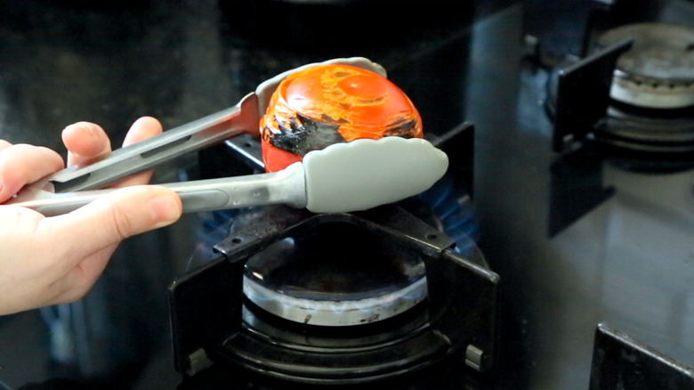 Start by doing something you may not have done before: Grab your whole tomatoes with tongs or something similar and place them over the open flame of your stove until they're charred on all sides, then pop them in a blender until they're pureed. Set this aside for now — you're going to need it later.