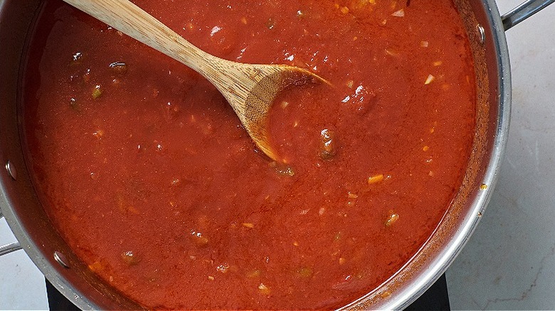 Add in the crushed tomatoes and fish stock and bring to a steady simmer. For a more textured stew, use diced tomatoes instead. For a smoother, sauce-like consistency, use tomato purée. Simmer for at least 15 minutes to let the flavors join together, adding more stock as needed if the mixture gets too thick. The broth should be the consistency of marinara sauce.