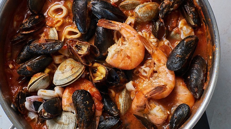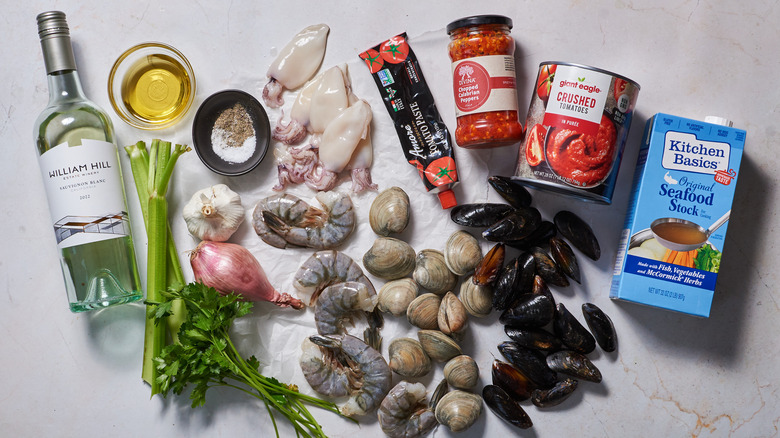 To create the saucy broth of cioppino, first grab olive oil, shallot, celery, Calabrian chiles, tomato paste, and white wine. You can find Calabrian chiles in the International aisle or near the jarred peppers in the grocery store; look for crushed chiles, which are easy to scoop into your skillet. After adding the wine (we suggest a dry white like sauvignon blanc), you'll need a large can of crushed tomatoes and a couple of cups of fish stock or broth. You can also use vegetable or chicken stock if needed. The fish used in this recipe are clams, mussels, squid, and shrimp, but you can throw in flaky white fish, crab legs, scallops, or lobster if desired (cioppino is a great way to clean out the freezer). Whichever fish you choose to use, season with salt and pepper and sprinkle with parsley to serve.