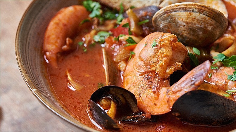 Like its cousin stew bouillabaisse, cioppino came from humble origins, thrown together in large pots with local fishermen's end-of-day catch. Cioppino originated in San Francisco, California, from Italian-American immigrants who needed to use local resources to make cheap, filling meals. Unlike the delicate French stew that emphasizes saffron, fish stock, and fennel, the Italian-American dish leans heavily on tomato, using plenty of garlic and fresh parsley to give it a distinctly Italian flavor. Both hearty soups can use any variety of fish you have on hand (since after all, that's how it was originally made), but a cioppino is much more likely to have shellfish like crab, mussels, clams, and squid.