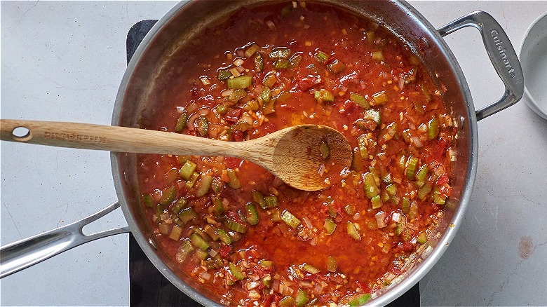 - Heat olive oil in a large, deep skillet or Dutch oven over medium heat. Add the shallot, garlic, and celery and cook until fragrant and soft, about 2-3 minutes. Stir in the chiles, and once incorporated, stir in the tomato paste and combine. As the paste starts sticking to the bottom of the pot, add the wine and bring to a simmer.