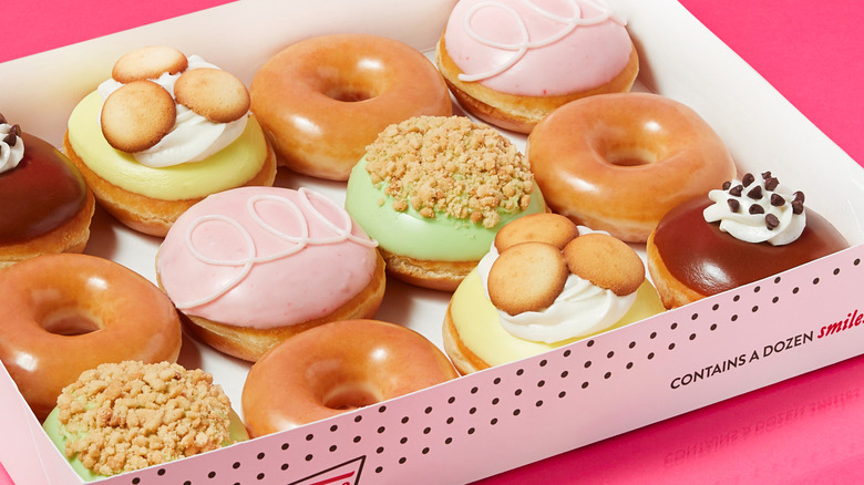 If some of the specialty doughnuts included in the Fan Favs lineup look especially familiar, your eyes aren't playing tricks on you. The brand's Banana Pudding Doughnut was actually already re-released once as part of Krispy Kreme's 2020 Dessert Doughnuts Collection. Likewise, the Strawberries & Kreme Doughnut features striking similarities to a previously launched Valentine-themed doughnut. Yet, while frequent reappearances on menu boards mean that these flavors could have staying power long-term, the choice to keep bringing them back for a limited time seems to work in Krispy Kreme's favor, adding a degree of exclusivity.