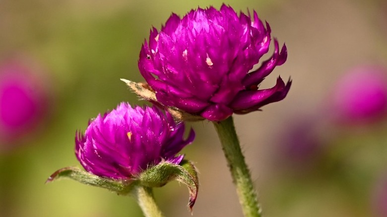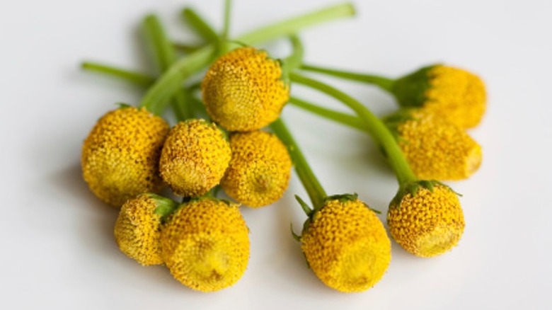 Buzz buttons defy any expectation you may have about what edible flowers should taste like. Eating these flowers can be more like eating a snack from an alien planet than munching on something Mother Nature created. While their flavor is tart and a bit acidic in an herbal way, these flowers are used more for the sensory experience they provide. Also known as Szechuan buttons (after the pepper that has a similar effect), electric buttons, or electric daisies, these unusual button-shaped buds contain spilanthol, an alkaloid that causes a tingling sensation, per Saveur. For this reason, they were once used medicinally to numb the mouth and treat toothaches and sore throats.