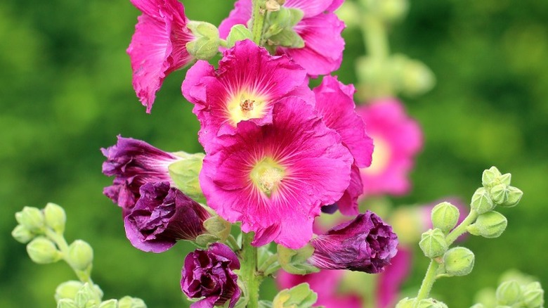 Closely related to the tangy and tart hibiscus flower, hollyhocks are native to China and grow in a variety of colors, from pink to black. Although hollyhocks are edible, they have a reputation for being much less tasty than their tropical cousin. The flavor isn't necessarily revolting; it's more like nearly nonexistent. The extreme blandness can be off-putting, and when eaten on their own hollyhocks, the dull taste and unpleasant texture make for a less-than-palatable experience.
