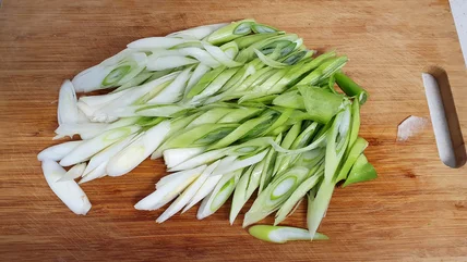 If you're cutting a stalky veggie, like celery, scallions, or leeks, line them together, and then nudge them into an angle using the edge of your knife. Then place your knife over the stalks at a 45-degree angle, where the tip points towards the corner of your chopping board. Begin to chop slowly, keeping an eye on thickness. Adjust the angle of your knife if you start losing the clean diagonal, and chop in a rocking motion to create consistent cuts. You'll have perfect slices on the bias in no time.