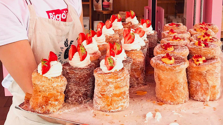 Choose from gorgeously sweet frangipane-filled almond croissants, crowd-pleasing pain au chocolat, or the classic golden brown, flaky, buttery plain croissants. That standard version is also available filled with sweet vanilla cream and juicy fresh strawberries. For a change of pace opt for Donutelier's viral spiral croissants. They come in two flavors: hazelnut praline and pistachio raspberry, a gorgeously decadent affair rolled in crushed nuts, filled with smooth pistachio cream, and topped with dried raspberries.