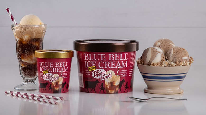 Now that sunny days are well on their way, Blue Bell and Dr Pepper are joining forces to bring fans a refreshing, sweet treat inspired by the ice cream float: the Dr Pepper Float ice cream (via a press release). This is a limited-time ice cream flavor that brings all the floaty flavor to one convenient pint container — no soda can necessary.