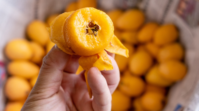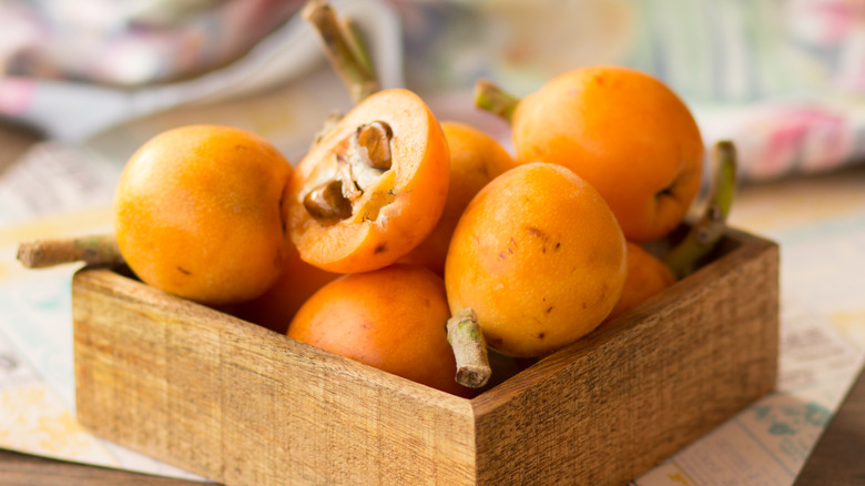 The nutritional stats for loquats are pretty impressive. In a 1 cup serving, which only has 70 calories, you'll get an array of vitamins and minerals including 46% of your daily requirement for provitamin A carotenoids, per Healthline. The body converts this into vitamin A, which in turn supports your immune system, vision, and organ health. Furthermore, carotenoids offer anti-inflammatory and antioxidant benefits and they help in the fight against cancer and heart disease. Loquats also contain magnesium and potassium, two minerals that support heart function and help manage healthy blood pressure levels.