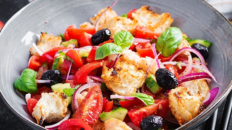 You will want to hold off on putting your salad together right before serving to ensure your toasty bread doesn't sog up too much. When your guests are ready, toss the veggies and bread cubes with oil and vinegar. A bit of sea salt and black pepper won't hurt, either.