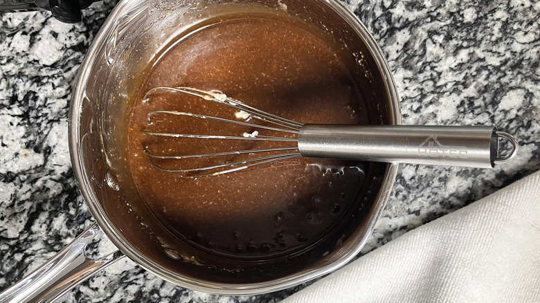 - In a separate small saucepan, add the remaining cocoa powder, ½ stick of butter, dark brown sugar, and gochujang over low heat.