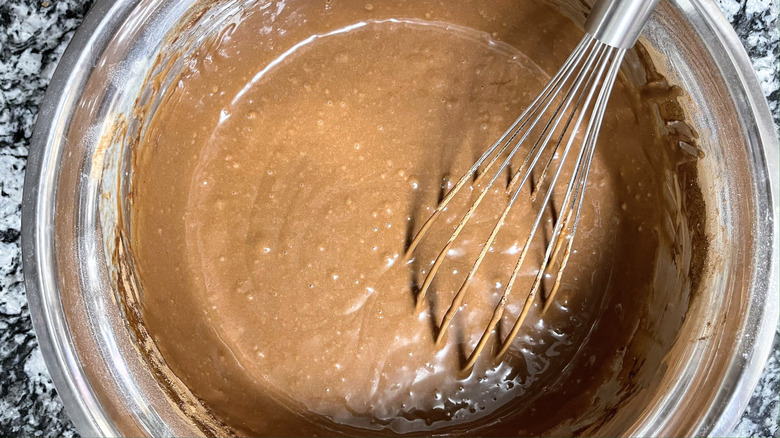 MIx the contents until they are uniform, then pour the wet ingredients into the bowl with the flour and sugar. Sift ½ cup of cocoa powder over the batter (to prevent lumps) and whisk the ingredients until there are no more streaks. Barrett describes, "It will be a loose batter, but don't be concerned."