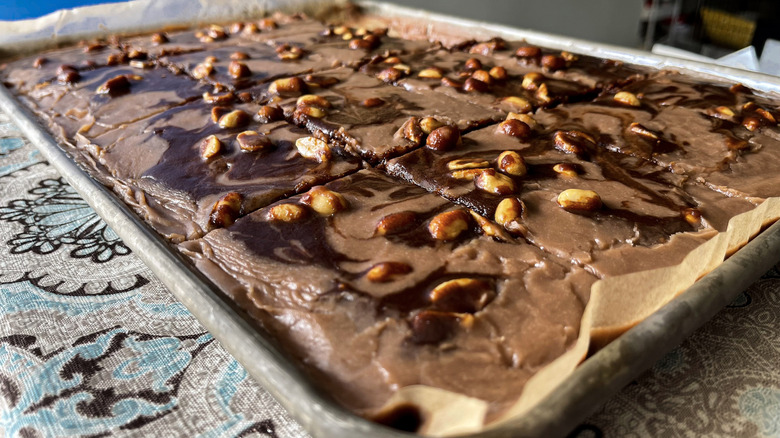 Natural cocoa powder, unsalted butter, and confectioners' sugar make up the chocolate icing. Barrett notes that she isn't a fan of very sweet desserts, so she keeps the sugar content low. She shares, "Frankly, I'm not even a fan of cake icing, which is why this recipe has been such a treat." It really is all about balance. Finally, for the gochujang swirl, she uses more cocoa powder, butter, dark brown sugar, gochujang, and roasted unsalted peanuts. About the latter, they make a great addition with the sweet and spicy icing, and "help keep the element of texture people enjoy from a traditional Texas sheet cake."