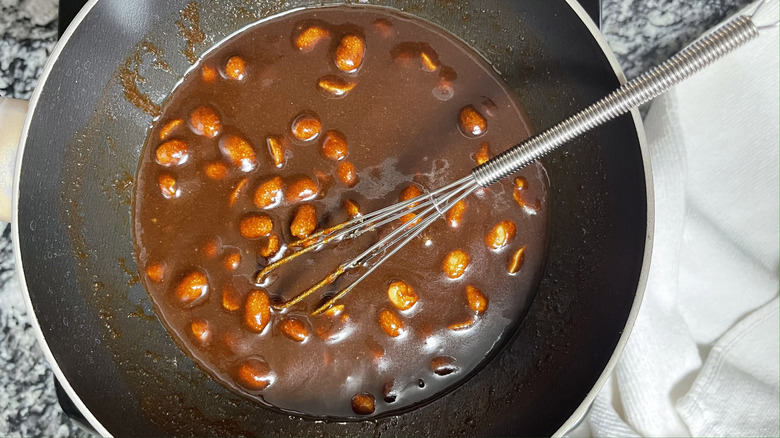 For the gochujang icing, place another small saucepan over low heat and add 1 tablespoon of cocoa powder, ½ stick of butter, brown sugar, and gochujang. Whisk the ingredients for about 2 minutes then stir in the peanuts and take the pan off the burner.
