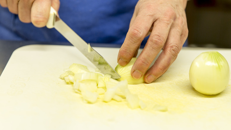We previously mentioned the non-root end of the onion. That's the end that doesn't have tough, hairy shoots growing out of it, should you have any doubts about which end you should be looking for.