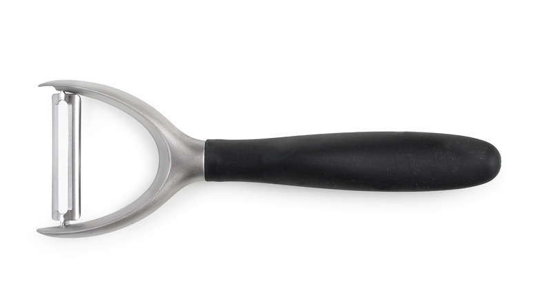 Another safer option is to use a vegetable peeler. In this case, you'll want to peel your onion whole instead of cutting it in half. Standing the onion on end, draw the peeler across the cut end, shaving the onion. Remembering the sharp knife concept, you'll want an equally sharp peeler for this job to stave off the waterworks. So don't use the peeler that's been at the bottom of your kitchen drawer for far too long. They're inexpensive; Spring for a new one. For better stability, you can stick a fork in the side of the onion to hold it secure.