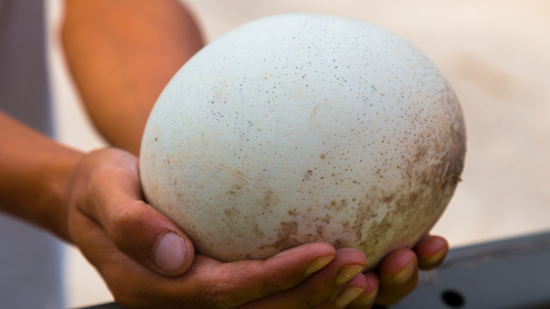 As the largest bird in the world, it only makes sense that ostriches lay the most massive eggs we've ever seen — six inches long and (at least) three pounds to be exact. That's about 20 times the size of a chicken egg in case you're keeping track. Aside from being a site to see, ostrich eggs are also supremely delicious. The eggs of these flightless birds are rich, buttery, and slightly gamey.