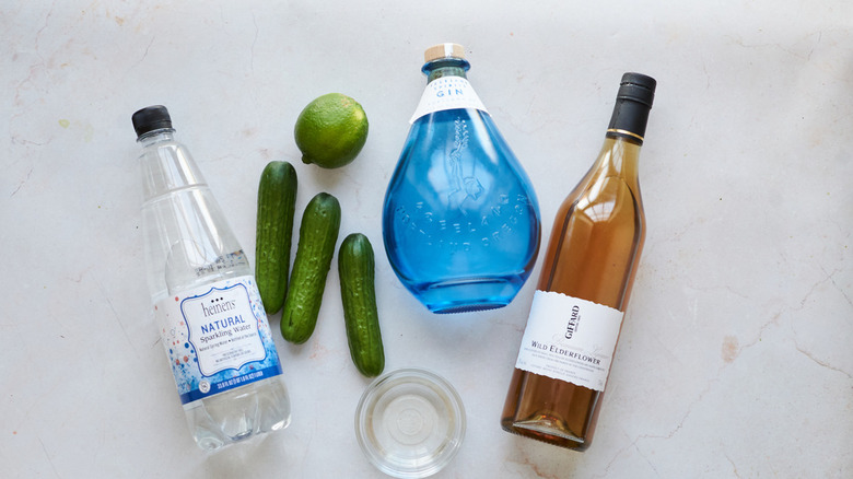 Simply put, you'll need cucumbers, gin, elderflower liqueur, simple syrup, lime juice, and soda water. The drink will change quite a bit based on the gin you use, so we recommend using a floral, cucumber-forward gin like Hendrick's or a botanical like small-batch Freeland. Elderflower liqueur might not already be on your bar cart, but it should be pretty straightforward to find at the liquor store. Topping the drink is also your choice; soda water or tonic is the most common, but you can opt for Sprite for a sweeter drink.